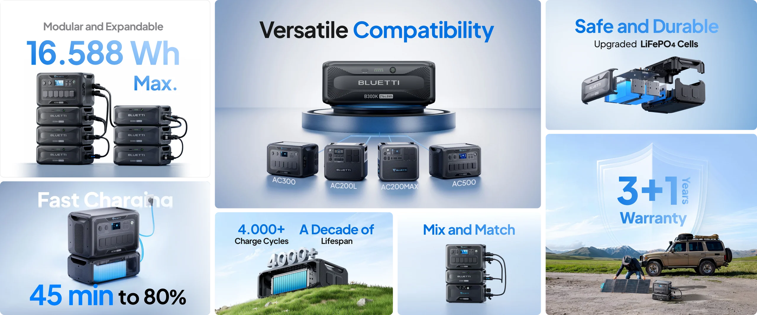 • Sistem modular off-grid: dacă ai panouri solare + staţie BLUETTI compatibilă, poţi extinde capacitatea pas cu pas cu acest modul.